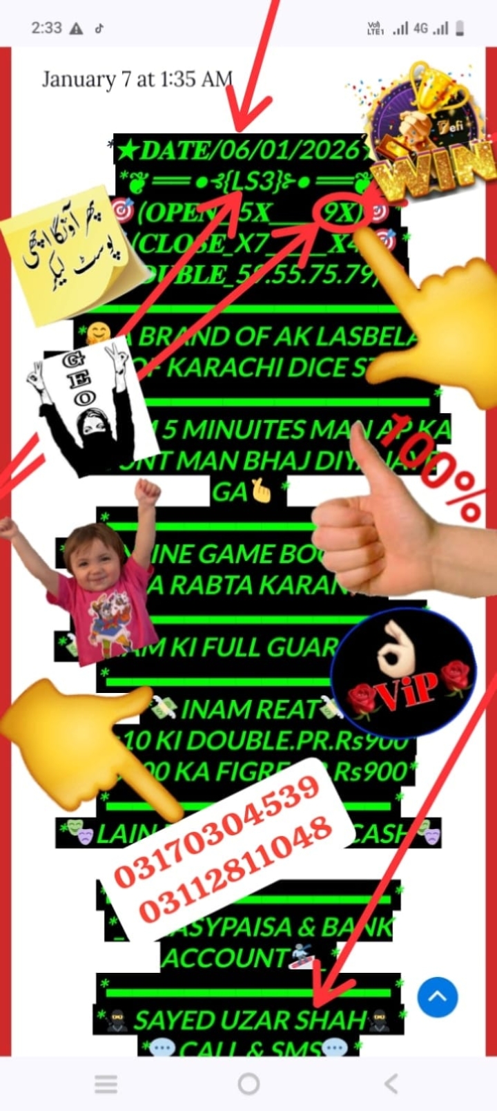 *ڈیلی لسبیلا آن لائن گیم کی بکنگ ہےجو دوست کام کی مصروفیات کی وجہ سے اڈّے پر نہیں جا سکتےاور اپنا گیم مِس کر دیتے ہیں وہ دوست اَب بے فِکر ہو جائیں کیونکہ اّب آپ کو سید اوزیر دے رہا ہے آن لائن گیم کھیلنے کی سہولت وہ بھی گھر بیٹھے انعام کی فُل گارنٹی ہے گیم کھیلنے کے لیے رابطہ کریں*